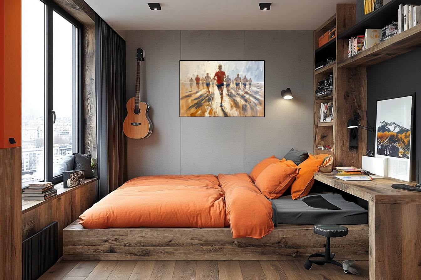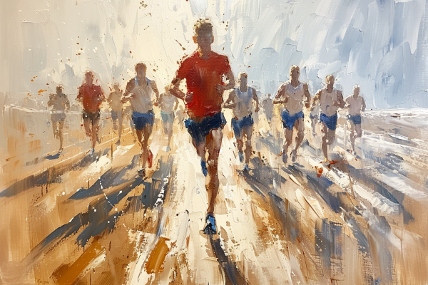 Un marathon où les coureurs fusionnent en une vague de couleurs - ocres chauds, bleus froids, touches de blanc lumineux. Chaque silhouette devient un fragment d'un mouvement collectif, où l'individu et le groupe dialoguent dans une chorégraphie dynamique.