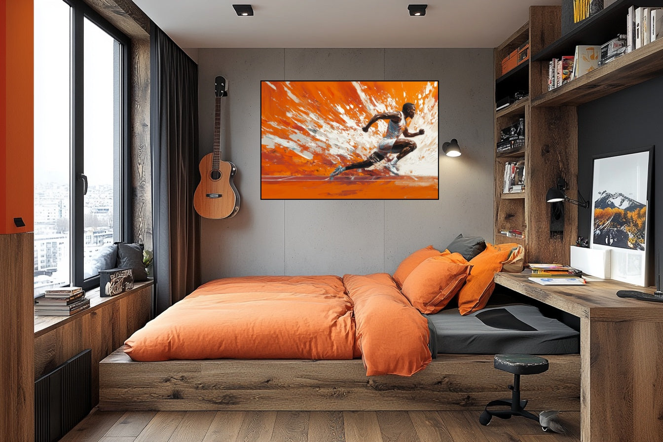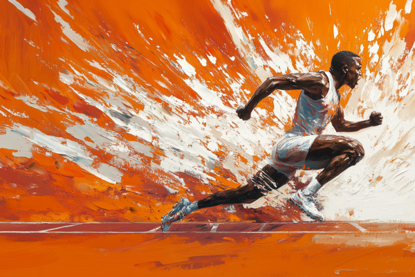 Un tableau où l'orange volcanique explose littéralement autour du sprinter. Les projections blanc et ocre créent un mouvement cyclonique, chaque éclaboussure capturant la tension du départ. Le corps devient épicentre d'une déflagration cinétique, les couleurs traduisant la puissance brute du mouvement.