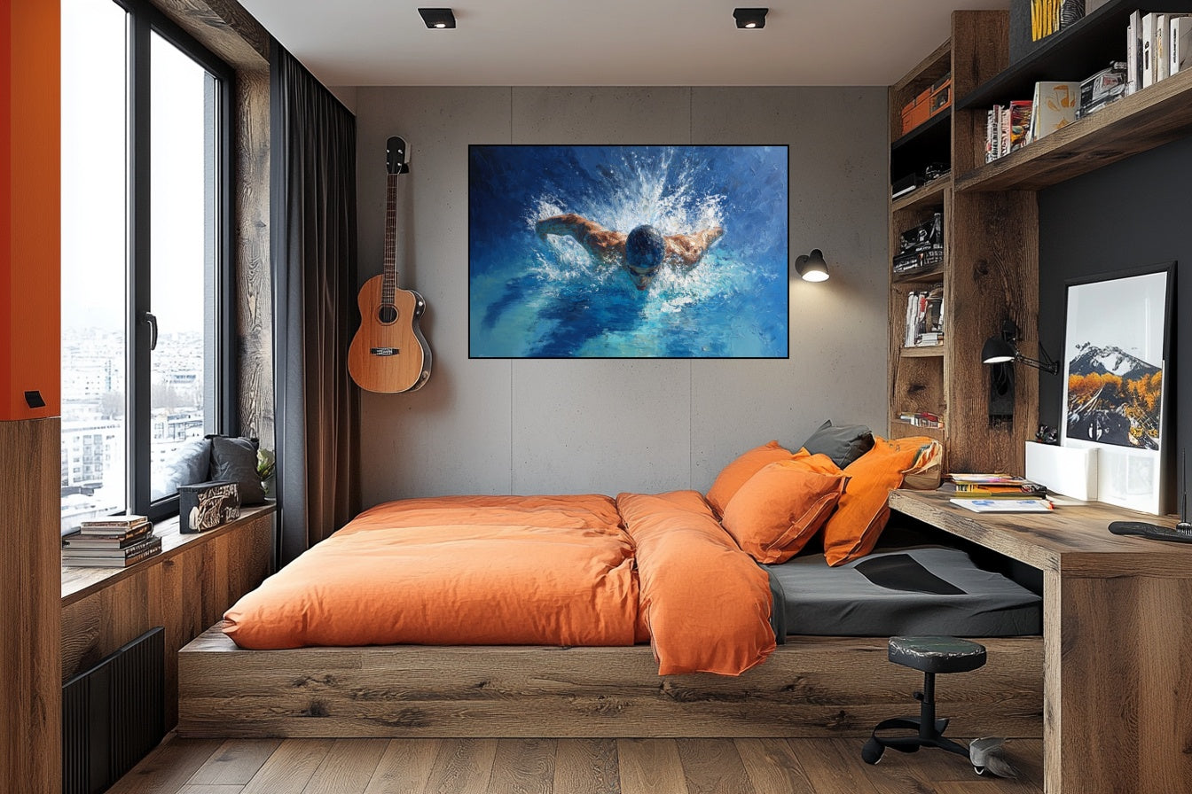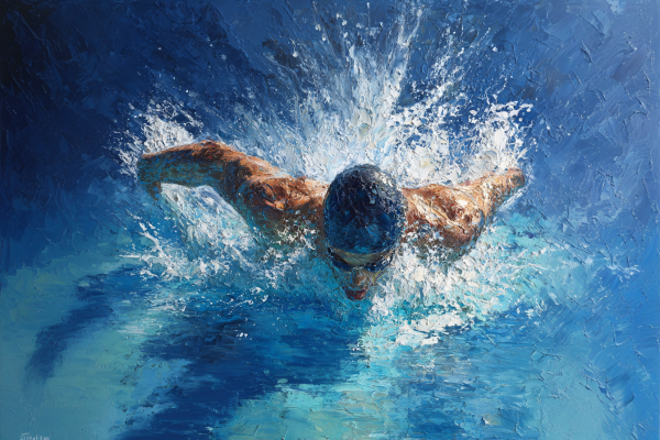 Un tableau où les bleus profonds de l'eau s'entrechoquent avec les tons bronzés du nageur. Les coups de palette épais créent un relief où chaque éclaboussure devient un fragment de mouvement - blanc écumeux, bleu marine, touches ambrées. Le corps semble littéralement exploser la surface, transformant la résistance liquide en symphonie picturale