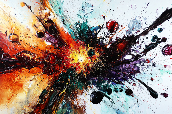 Traits noirs, oranges, turquoise, violets qui jaillissent.