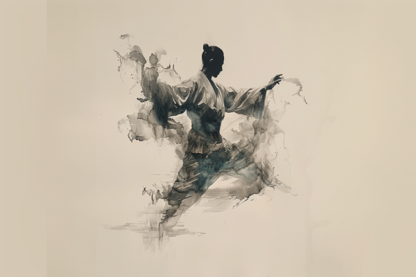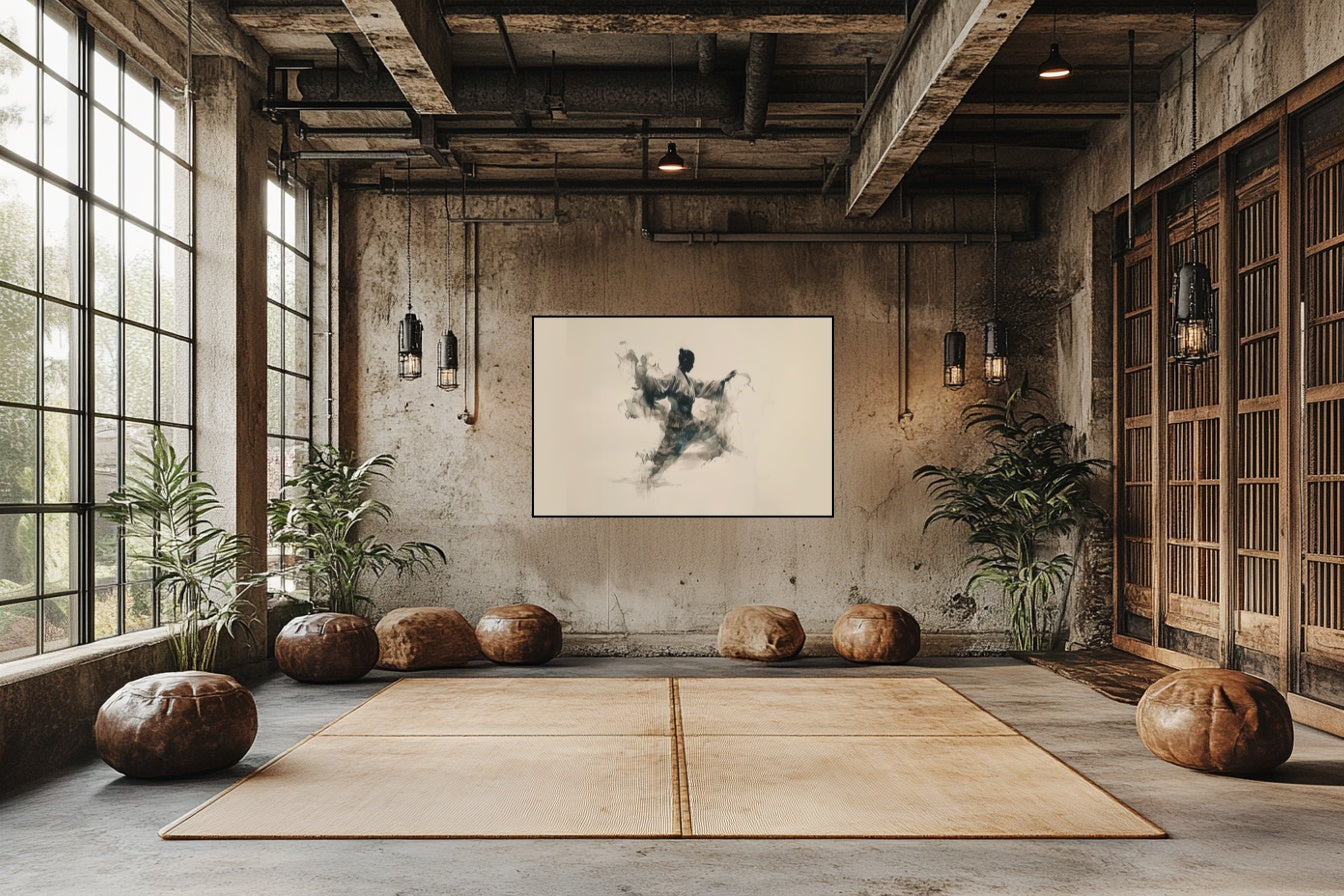 Le corps se décompose en flux et en énergie. Un karatéka dont la silhouette se dissout dans l'encre, où le mouvement devient plus réel que la chair. La danse martiale transcendée en poésie visuelle.
