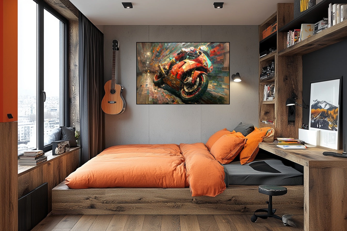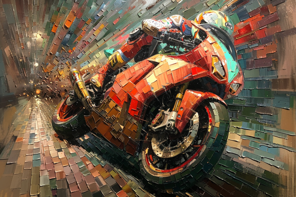 La moto explose en un kaléidoscope de fragments, où chaque tesson devient une parcelle de mouvement. Rouge ardent, vert profond, ocre lumineux - les couleurs se décomposent et se recomposent, capturant l'instant où la vitesse devient une forme de désintégration et de reconstruction instantanée.