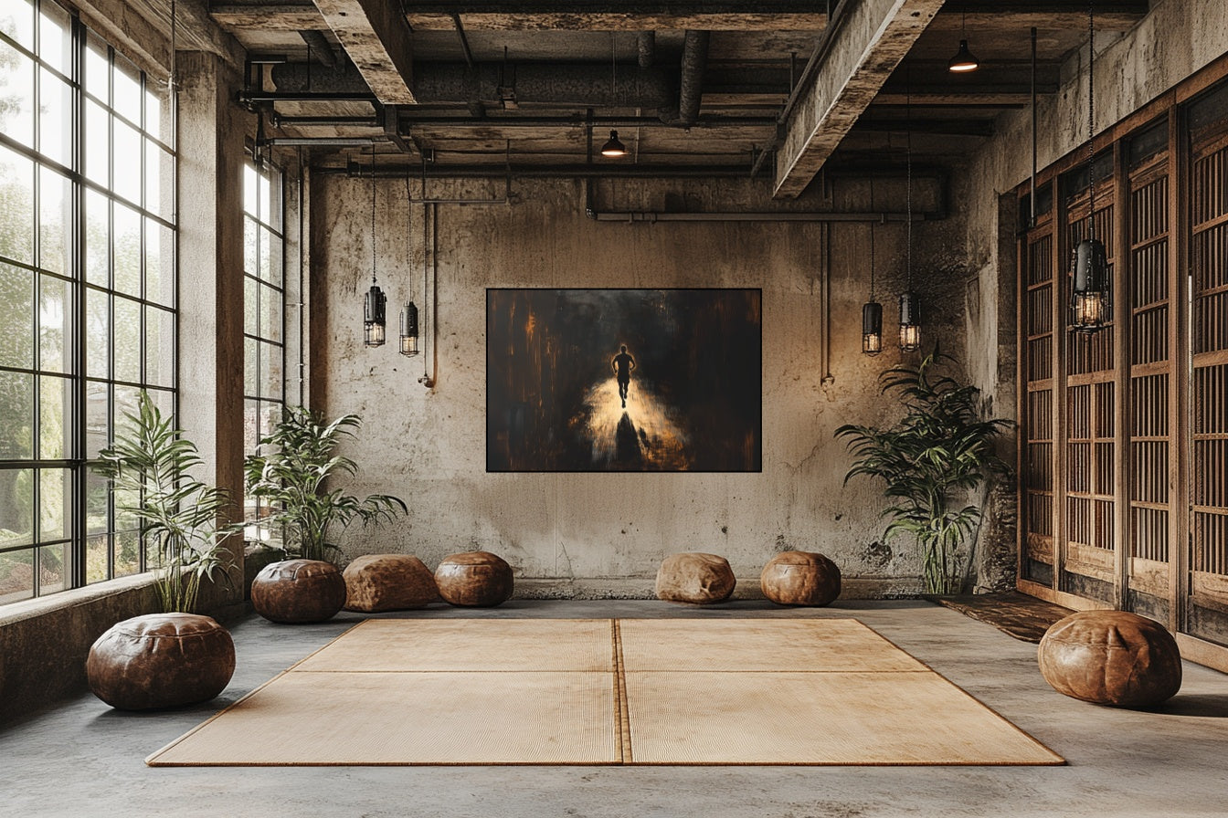 Un marathon où l'or et le noir se confrontent. Un coureur illuminé émerge des ténèbres, ses contours baignés d'une lumière ocre représente l'aura de son combat intérieur. L’ ombre devient un récit de résilience et les rayons une métaphore de l'espoir.