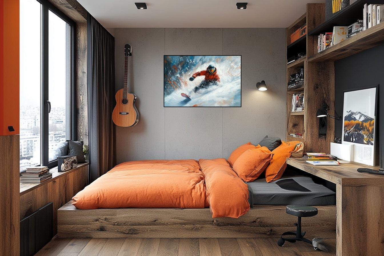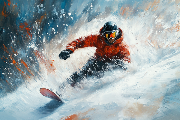 Une représentation où les blancs cristallins et les rouges ardents capturent un snowboarder en mouvement. Les coups de palette créent une tempête de neige picturale, où chaque nuance raconte la vitesse et l'énergie. L'athlète semble se dissoudre et se reconstituer à chaque instant, fusionnant avec l'élément.