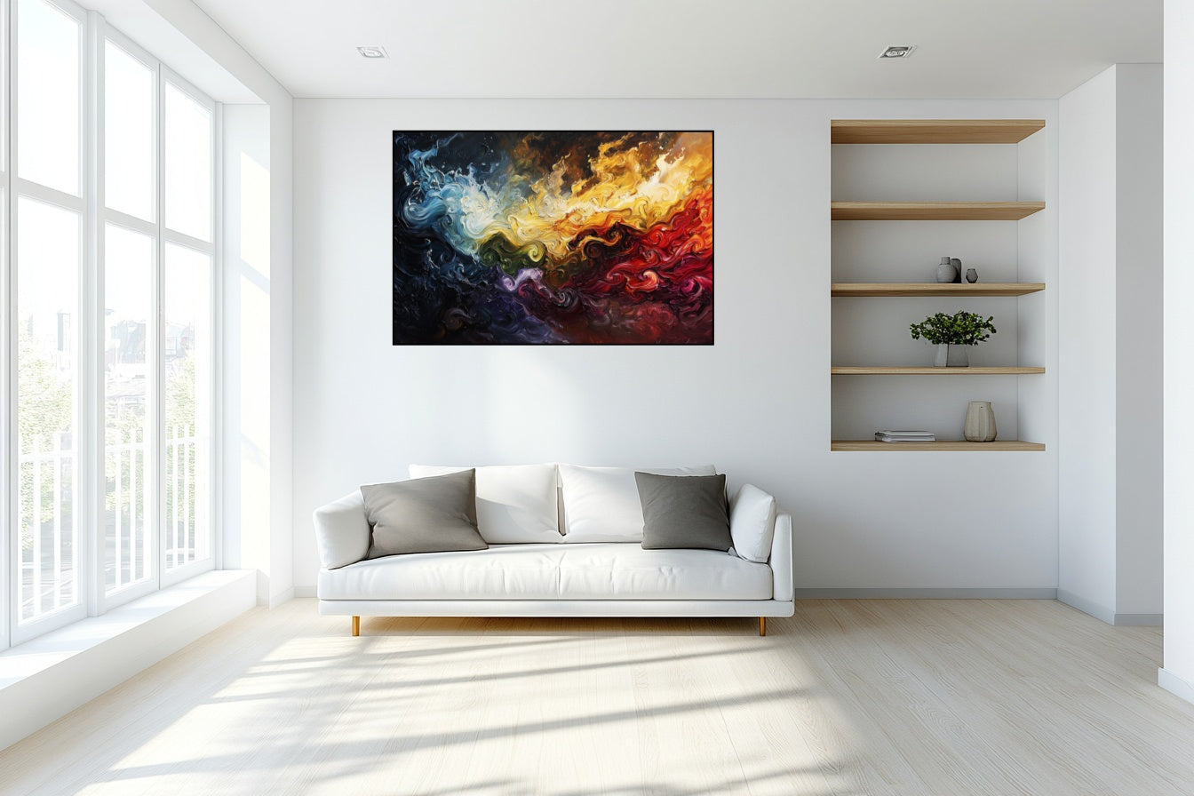 Bleus glacés et rouges incandescents en tourbillons opposés.